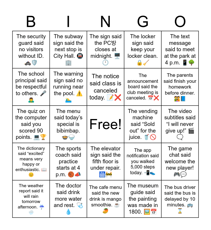 This bingo card has a free space and 33 words: The teacher said the test is on Friday. ๐ โ๏ธ, The announcement said school starts at 9 a.m. tomorrow. ๐ข๐ซ, The menu said todayโs special is bibimbap. ๐ฒ๐, The webtoon said the hero found a secret power. ๐ฆธโโ๏ธโจ, The dictionary said โexcitedโ means very happy or enthusiastic. ๐๐, The warning sign said no running near the pool. โ ๏ธ๐โโ๏ธ, The text message said to meet at the park at 4 p.m. ๐ฑ๐ณ, The weather report said it will rain tomorrow afternoon. โ๐ง๏ธ, The subway sign said the next stop is City Hall. ๐๐ข, The game instructions said collect three keys to unlock the bonus level. ๐ฎ๐, The notice said class is canceled today. ๐โ, The sign said the PC๋ฐฉ closes at midnight. ๐ฅ๏ธ๐, The library rules said no talking inside. ๐๐คซ, The school newspaper said the festival is next Friday. ๐ฐ๐, The vending machine said โSold outโ for the juice. ๐ฅค๐ซ, The parents said finish your homework before dinner. ๐ช๐, The doctor said drink more water and rest. ๐ฉบ๐ง, The quiz on the computer said you scored 90 points. ๐ป๐, The sports coach said practice starts at 4 p.m. ๐๐ฃ, The app notification said you walked 5,000 steps today. ๐ฒ๐, The elevator sign said the fifth floor is under repair. ๐๐ง, The instructions on the exam paper said answer all questions. ๐โ๏ธ, The security guard said no visitors without ID. ๐๐ก๏ธ, The video subtitles said โI will never give up!โ ๐ฌ๐จ๏ธ, The cafe menu said the new drink is mango smoothie. โ๐ฅญ, The bus driver said the bus is delayed by 10 minutes. ๐โ, The locker sign said keep your locker clean. ๐๐งน, The announcement board said the club meeting is canceled. ๐ โ, The school principal said be respectful to others. ๐ค๐โโ๏ธ, The game chat said welcome the new player! ๐ฎ๐ฌ, The emergency alert said there is a fire drill at 3 p.m. ๐จ๐ฅ, The museum guide said the painting was made in 1800. ๐ผ๏ธ๐ and The coach said the team will try a new strategy tomorrow. โฝ๐.