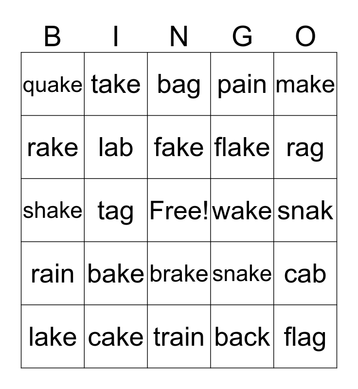 This bingo card has a free space and 24 words: bake, cake, fake, lake, make, quake, rake, take, wake, brake, flake, shake, snake, cab, lab, back, snak, bag, rag, tag, flag, rain, pain and train.