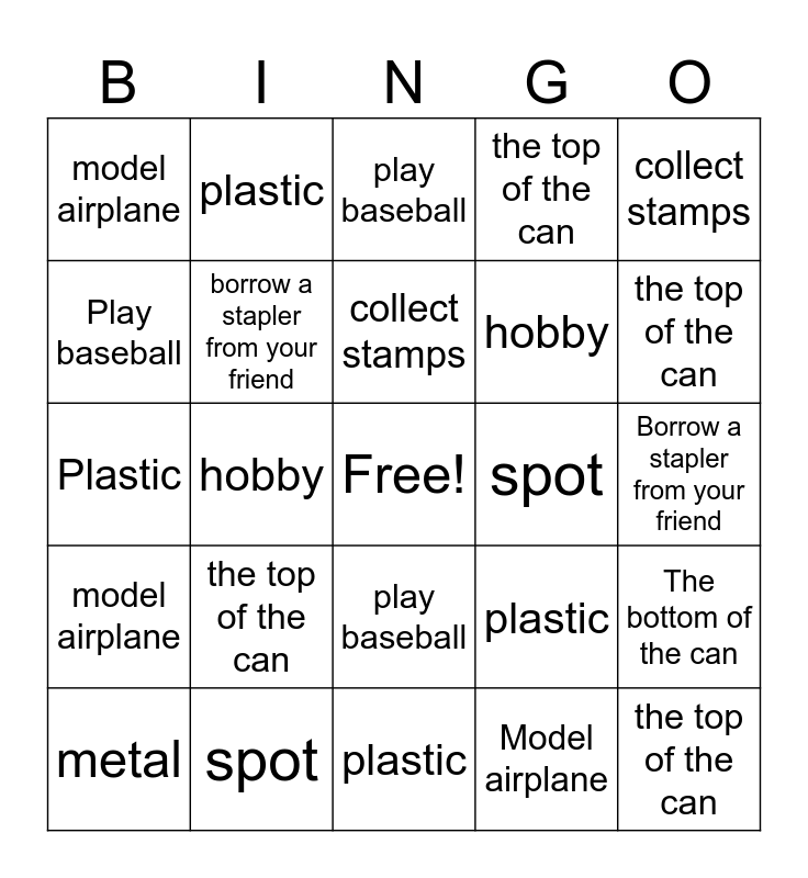⚠ This card has duplicate items: model airplane (4), plastic (4), play baseball (4), borrow a stapler from your friend (4), collect stamps (4), hobby (4), the bottom of the can (4), the top of the can (4), spot (4), Collect stamps (2), The bottom of the can (2), Spot (2), Hobby (2), Borrow a stapler from your friend (2), Play baseball (2), The top of the can (2), Plastic (2), Model airplane (2)