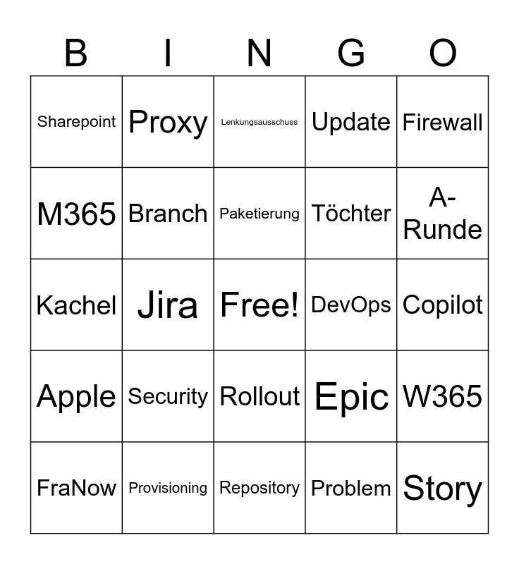 This bingo card has a free space and 35 words: Azure, Flow, Commit, Branch, Rollout, Update, M365, GPT, Paketierung, Smart, Kachel, Firewall, Enterprise, Intune, Sharepoint, DevOps, Problem, Jira, Apple, Story, Epic, FraNow, W365, Provisioning, Lenkungsausschuss, A-Runde, Windows 11, Applikationsliste, Töchter, Copilot, VPN, Repository, Security, Proxy and Autoupdater.