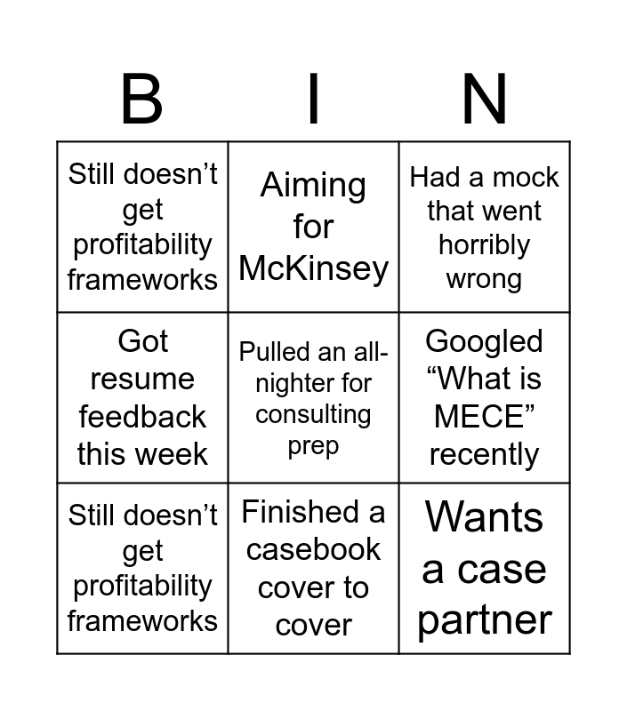 This bingo card has 12 words: Solved a case in pajamas, Wants a case partner, Pulled an all-nighter for consulting prep, Googled “What is MECE” recently, Aiming for McKinsey, Had a mock that went horribly wrong, Finished a casebook cover to cover, Just joined the group this week, Still doesn’t get profitability frameworks, Got resume feedback this week, Still doesn’t get profitability frameworks and Googled “What is MECE” recently.