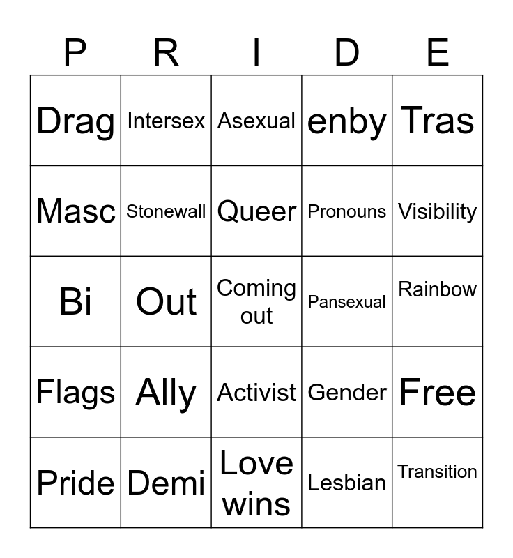 This bingo card has a free space and 24 words: Pride, Ally, Queer, Lesbian, Tras, Drag, Intersex, Asexual, Pansexual, Rainbow, Bi, Stonewall, Gender, Free, Masc, Demi, Love wins, enby, Visibility, Flags, Out, Activist, Pronouns and Transition.