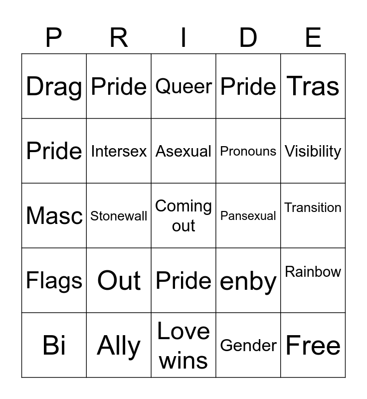 This bingo card has a free space and 29 words: Pride, Ally, Queer, Lesbian, Tras, Drag, Intersex, Asexual, Pansexual, Rainbow, Bi, Stonewall, Gender, Free, Masc, Demi, Love wins, enby, Visibility, Flags, Out, Activist, Pronouns, Transition, Pride, Pride, Pride, Pride and Pride.
