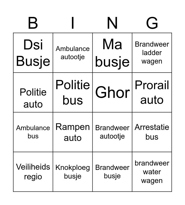 This bingo card has 16 words: Knokploeg busje, Arrestatie bus, Ma busje, Dsi Busje, Ambulance bus, Ambulance autootje, Brandweer autootje, Brandweer busje, Politie auto, Politie bus, Veiliheids regio, Brandweer ladder wagen, Rampen auto, Prorail auto, Ghor and brandweer water wagen.