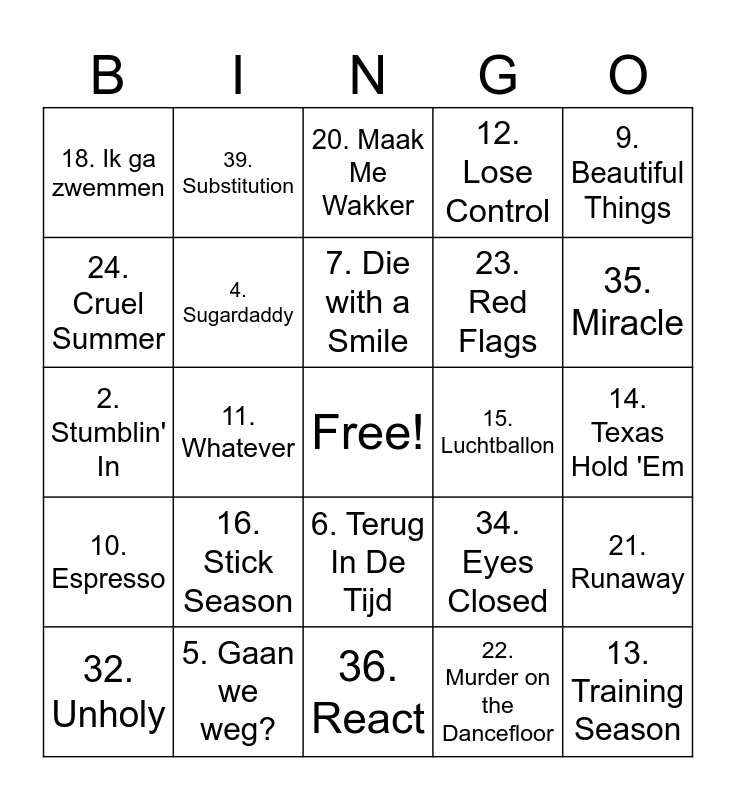 This bingo card has a free space and 40 words: 1. Greedy, 2. Stumblin' In, 3. Europapa, 4. Sugardaddy, 5. Gaan we weg?, 6. Terug In De Tijd, 7. Die with a Smile, 8. Fortnight, 9. Beautiful Things, 10. Espresso, 11. Whatever, 12. Lose Control, 13. Training Season, 14. Texas Hold 'Em, 15. Luchtballon, 16. Stick Season, 17. Overdrive, 18. Ik ga zwemmen, 19. End of Beginning, 20. Maak Me Wakker, 21. Runaway, 22. Murder on the Dancefloor, 23. Red Flags, 24. Cruel Summer, 25. Until I Found You, 26. Dance the Night, 27. Padam Padam, 28. Calm Down, 29. Zoveel Te Doen, 30. I'm Not Here to Make Friends, 31. As It Was, 32. Unholy, 33. Flowers, 34. Eyes Closed, 35. Miracle, 36. React, 37. Anti-Hero, 38. Cupid, 39. Substitution and 40. Ceilings.