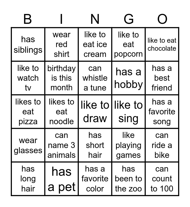 This bingo card has 25 words: wear glasses, has a pet, like to draw, has been to the zoo, like to eat chocolate, has siblings, wear red shirt, like to eat ice cream, like to sing, can ride a bike, like to watch tv, birthday is this month, has a favorite color, like playing games, has a best friend, has long hair, likes to eat noodle, can whistle a tune, has a hobby, has a favorite song, likes to eat pizza, can name 3 animals, has short hair, like to eat popcorn and can count to 100.