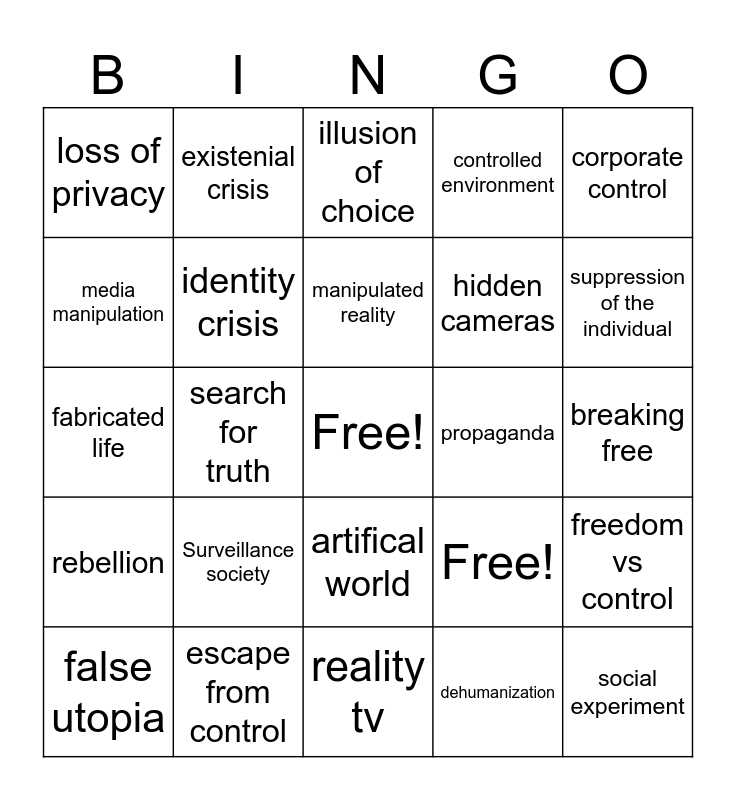 This bingo card has a free space and 25 words: Surveillance society, reality tv, manipulated reality, false utopia, corporate control, loss of privacy, media manipulation, existenial crisis, propaganda, artifical world, hidden cameras, fabricated life, Free!, freedom vs control, identity crisis, scripted life, breaking free, illusion of choice, suppression of the individual, search for truth, social experiment, escape from control, rebellion, controlled environment and dehumanization.