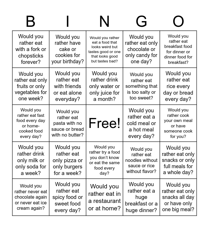 This bingo card has a free space and 24 words: Would you rather eat only pizza or only burgers for a week?, Would you rather eat spicy food or sweet food every day?, Would you rather drink only water or only juice for a month?, Would you rather never eat chocolate again or never eat ice cream again?, Would you rather eat breakfast food for dinner or dinner food for breakfast?, Would you rather eat with a fork or chopsticks forever?, Would you rather eat only fruits or only vegetables for one week?, Would you rather have cake or cookies for your birthday?, Would you rather eat a cold meal or a hot meal every day?, Would you rather try a food you don’t know or eat the same food every day?, Would you rather eat something that is too salty or too sweet?, Would you rather eat fast food every day or home-cooked food every day?, Would you rather eat noodles without sauce or rice without flavor?, Would you rather eat only snacks or only full meals for a whole day?, Would you rather eat with friends or eat alone everyday?, Would you rather eat a huge breakfast or a huge dinner?, Would you rather cook your own meal or have someone cook for you?, Would you rather eat a food that looks weird but tastes good or one that looks good but tastes bad?, Would you rather eat rice every day or bread every day?, Would you rather eat pasta with no sauce or bread with no butter?, Would you rather eat only snacks all day or have only one big meal?, Would you rather drink only milk or only soda for a week?, Would you rather eat only chocolate or only candy for one day? and Would you rather eat in a restaurant or at home?.