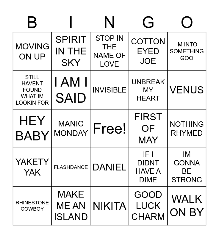 This bingo card has a free space and 44 words: SHES A LADY, WALK ON BY, WE BUILT THIS CITY, RHINESTONE COWBOY, WAKE ME UP, GOOD LUCK CHARM, STOP IN THE NAME OF LOVE, YOU GOT YOUR TROUBLES, IM INTO SOMETHING GOO, MAKE ME AN ISLAND, COTTON EYED JOE, FIRST OF MAY, DANIEL, FLASHDANCE, CALL ME, NIKITA, GOOD LOOKING WOMAN, HEY BABY, SUSPICOUS MINDS, VENUS, SPIRIT IN THE SKY, BREAKFAST IN TIFFANYS, YOU WIN AGAIN, MOVING ON UP, SWEET CAROLINE, NOTHING RHYMED, COLD AS ICE, IF YOU LEAVE ME NOW, IF I DIDNT HAVE A DIME, YAKETY YAK, BUILD ME UP BUTTERCUP, IM GONNA BE STRONG, ELECTRICK AVE, ON THE ONE ROAD, MANIC MONDAY, CRAZY WORLD, ITS MY PARTY, I FALL TO PIECES, INVISIBLE, STILL HAVENT FOUND WHAT IM LOOKIN FOR, UNBREAK MY HEART, SILVER LADY, I AM I SAID and DANCING IN THE DARK.