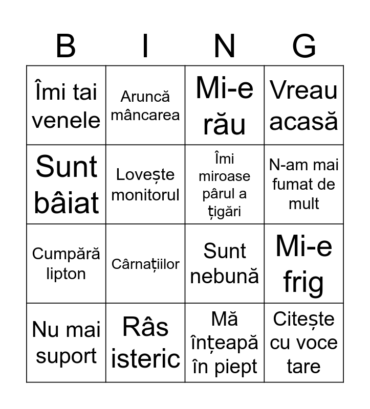 This bingo card has 17 words: Mă înțeapă în piept, Nu mai suport, Mi-e rău, Îmi tai venele, Cârnațiilor, Vreau acasă, Mi-e frig, Îmi miroase pârul a țigări, N-am mai fumat de mult, Lovește monitorul, Râs isteric, Sunt nebună, Sunt bâiat, Aruncă mâncarea, Cumpără lipton, Cumpără 7 Days and Citește cu voce tare.