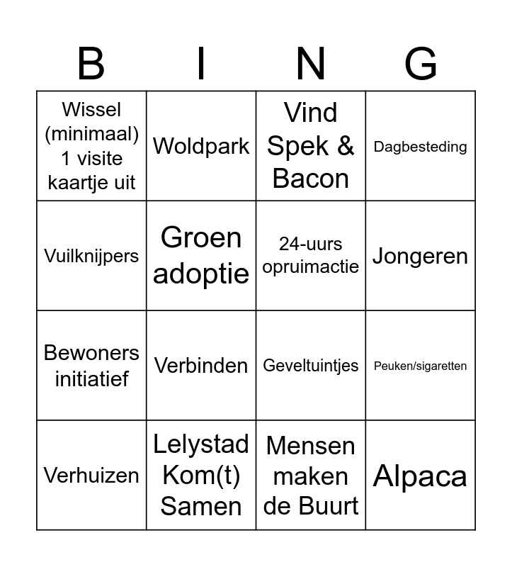 This bingo card has 24 words: Leefbaarheid, Verbinden, Jongeren, Een bewoner vertelt over een eigen initiatief, Vuilknijpers, Wissel (minimaal) 1 visite kaartje uit, Groen adoptie, Woldpark, Lelystad Kom(t) Samen, Hanging Baskets, Bewoners initiatief, Geveltuintjes, Zwerfafval, Leefbaarheid, 24-uurs opruimactie, Vind een moestuincoach, Mensen maken de Buurt, Vind Spek & Bacon, Verbinden, Peuken/sigaretten, Verhuizen, Alpaca, Dagbesteding and Onderwijs.