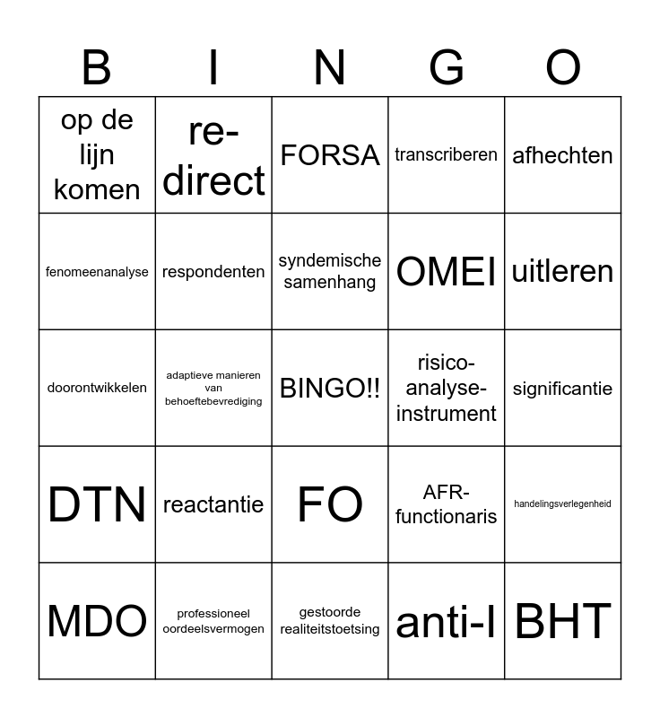 This bingo card has a free space and 24 words: reactantie, professioneel oordeelsvermogen, syndemische samenhang, MDO, afhechten, op de lijn komen, fenomeenanalyse, re-direct, risico-analyse-instrument, FO, OMEI, doorontwikkelen, AFR-functionaris, handelingsverlegenheid, respondenten, anti-I, significantie, FORSA, uitleren, adaptieve manieren van behoeftebevrediging, BHT, DTN, transcriberen and gestoorde realiteitstoetsing.