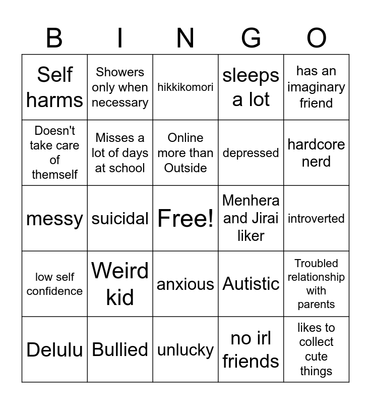 This bingo card has a free space and 24 words: Weird kid, Bullied, Online more than Outside, Delulu, has an imaginary friend, Self harms, Doesn't take care of themself, Showers only when necessary, Menhera and Jirai liker, anxious, depressed, messy, Autistic, Troubled relationship with parents, Misses a lot of days at school, no irl friends, introverted, hikkikomori, hardcore nerd, suicidal, likes to collect cute things, low self confidence, sleeps a lot and unlucky.