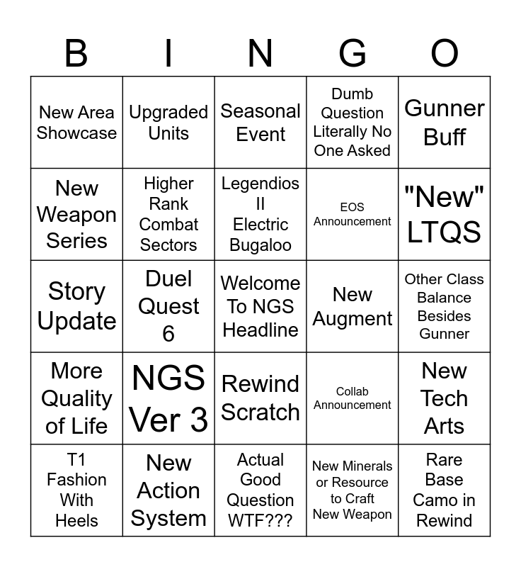 This bingo card has a free space and 24 words: NGS Ver 3, New Action System, Legendios II Electric Bugaloo, T1 Fashion With Heels, Gunner Buff, New Area Showcase, New Weapon Series, Upgraded Units, New Augment, Rewind Scratch, EOS Announcement, Story Update, Collab Announcement, New Tech Arts, Higher Rank Combat Sectors, New Minerals or Resource to Craft New Weapon, Other Class Balance Besides Gunner, Seasonal Event, "New" LTQS, Duel Quest 6, Rare Base Camo in Rewind, More Quality of Life, Dumb Question Literally No One Asked and Actual Good Question WTF???.