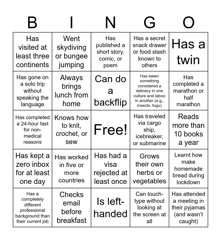 This bingo card has a free space and 25 words: Has worked in five or more countries, Is left-handed, Can do a backflip, Has a completely different professional background than their current job, Has a twin, Has visited at least three continents, Has gone on a solo trip without speaking the language, Went skydiving or bungee jumping, Has traveled via cargo ship, icebreaker, or submarine, Has had a visa rejected at least once, Has eaten something considered a delicacy in one culture and taboo in another (e.g., insects, fugu), Has completed a 24-hour fast for non-medical reasons, Grows their own herbs or vegetables, Learnt how make homemade bread during lockdown, Always brings lunch from home, Plays a musical instrument, Reads more than 10 books a year, Has published a short story, comic, or poem, Has completed a marathon or half marathon, Knows how to knit, crochet, or sew, Has attended a meeting in their pyjamas (and wasn’t caught), Checks email before breakfast, Has kept a zero inbox for at least one day, Has a secret snack drawer or food stash known to others and Can touch-type without looking at the screen at all.