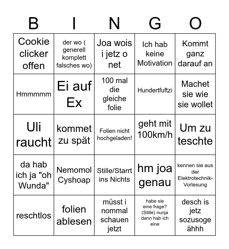 This bingo card has a free space and 24 words: Nemomol Cyshoap, folien ablesen, 100 mal die gleiche folie, reschtlos, Kommt ganz darauf an, Cookie clicker offen, Hmmmmm, der wo ( generell komplett falsches wo), geht mit 100km/h, Stille/Starrt ins Nichts, Hundertfuftzi, Uli raucht, hm joa genau, kennen sie aus der Elektrotechnik-Vorlesung, Ei auf Ex, habe sie eine frage? (Stille) nunja dann hab ich eine, Um zu teschte, Joa wois i jetz o net, Machet sie wie sie wollet, kommet zu spät, desch is jetz sozusoge ähhh, da hab ich ja "oh Wunda", Ich hab keine Motivation and müsst i nommal schauen jetzt.