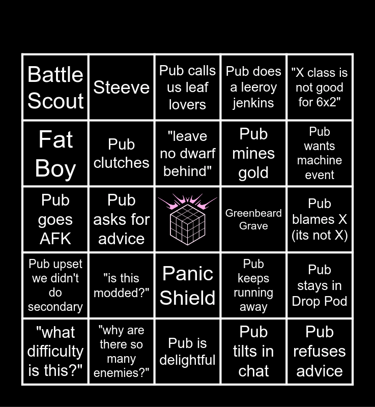 This bingo card has a free space and 24 words: "is this modded?", "why are there so many enemies?", "leave no dwarf behind", "what difficulty is this?", "X class is not good for 6x2", Battle Scout, Fat Boy, Steeve, Greenbeard Grave, Panic Shield, Pub mines gold, Pub goes AFK, Pub keeps running away, Pub stays in Drop Pod, Pub clutches, Pub tilts in chat, Pub blames X (its not X), Pub calls us leaf lovers, Pub wants machine event, Pub asks for advice, Pub refuses advice, Pub upset we didn't do secondary, Pub does a leeroy jenkins and Pub is delightful.