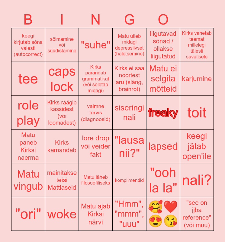 This bingo card has 49 words: flirtimine, role play, "mine magama, Kirke!", lapsed, freaky, komplimendid, sõimamine või süüdistamine, klassi-või koolikaaslase mainimine, Kirks vahetab teemat millelegi täiesti suvalisele, woke, tee, Matu ütleb midagi depressiivset (haletsemine), Kirks kamandab, Matu paneb Kirksi naerma, vandumine, Matu läheb filosoofiliseks, caps lock, Kirks räägib kassidest (või loomadest), freespace / (hüüd)nimed, liigutavad sõnad / ollakse liigutatud, karjumine, keegi jätab open'ile, keegi kirjutab sõna valesti (autocorrect), Kirks parandab grammatikat (või seletab midagi), keegi on segaduses, Kirks ei saa noortest aru (släng, brainrot), lore drop või veider fakt, tõsine või sügav teema, toit, siseringi nali, suvaline emoji, mainitakse teisi Mattiaseid, "see on jjba reference" (või muu), Kirks saadab häälsõnumi, "lausa nii?", Matu ajab Kirksi närvi, "Hmm", "mmm", "uuu", 🥰❤️😍😘, vaimne tervis (diagnoosid), "ori", mälu veab alt, "ooh la la", Matu vingub, Kirks vingub, Matu ei selgita mõtteid, "suhe", Matu vastab mõttetu sisutühja sõnumiga, nali? and Kirke mainib bingot.