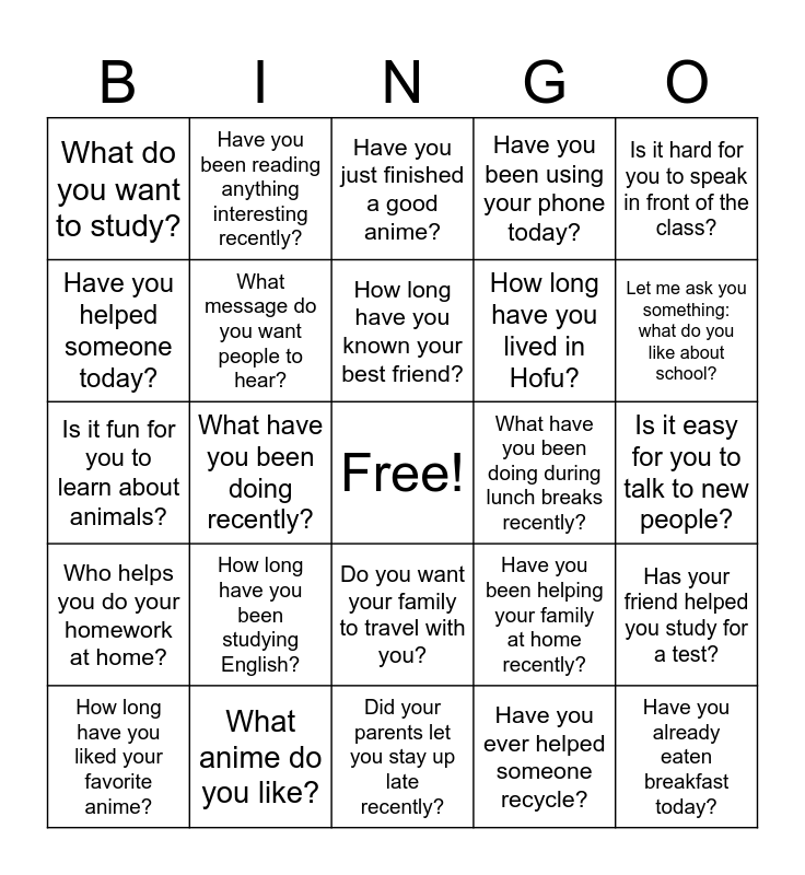 This bingo card has a free space and 24 words: How long have you been studying English?, What anime do you like?, How long have you known your best friend?, How long have you liked your favorite anime?, Is it hard for you to speak in front of the class?, What do you want to study?, Have you helped someone today?, Have you been reading anything interesting recently?, What have you been doing during lunch breaks recently?, Do you want your family to travel with you?, How long have you lived in Hofu?, Is it fun for you to learn about animals?, Have you been helping your family at home recently?, Has your friend helped you study for a test?, What message do you want people to hear?, Have you ever helped someone recycle?, Is it easy for you to talk to new people?, Have you just finished a good anime?, Let me ask you something: what do you like about school?, What have you been doing recently?, Have you already eaten breakfast today?, Who helps you do your homework at home?, Have you been using your phone today? and Did your parents let you stay up late recently?.