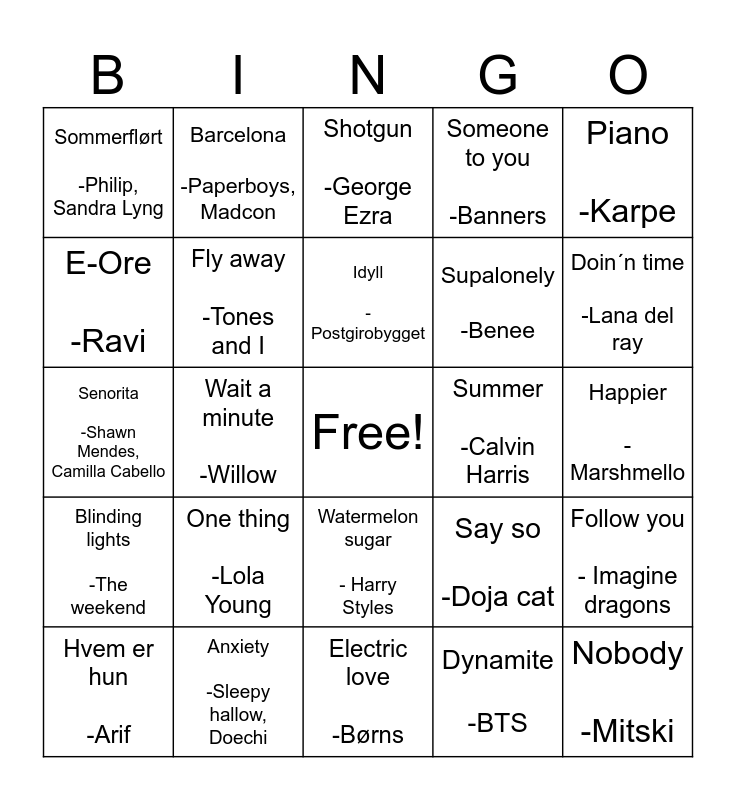 This bingo card has a free space and 24 words: One thing -Lola Young, Anxiety -Sleepy hallow, Doechi, Idyll -Postgirobygget, Hvem er hun -Arif, Piano -Karpe, Sommerflørt -Philip, Sandra Lyng, E-Ore -Ravi, Barcelona -Paperboys, Madcon, Summer -Calvin Harris, Watermelon sugar - Harry Styles, Supalonely -Benee, Senorita -Shawn Mendes, Camilla Cabello, Say so -Doja cat, Follow you - Imagine dragons, Fly away -Tones and I, Dynamite -BTS, Happier -Marshmello, Shotgun -George Ezra, Doin´n time -Lana del ray, Wait a minute -Willow, Nobody -Mitski, Blinding lights -The weekend, Someone to you -Banners and Electric love -Børns.