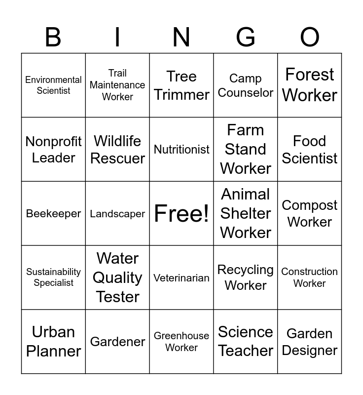 This bingo card has a free space and 30 words: Gardener, Farmer, Landscaper, Park Ranger, Environmental Scientist, Tree Trimmer, Wildlife Rescuer, Veterinarian, Animal Shelter Worker, Greenhouse Worker, Compost Worker, Garden Designer, Science Teacher, Environmental Educator, Food Scientist, Chef, Recycling Worker, Sustainability Specialist, Water Quality Tester, Forest Worker, Beekeeper, Plant Scientist, Trail Maintenance Worker, Farm Stand Worker, Nonprofit Leader, Camp Counselor, Construction Worker, Urban Planner, Nutritionist and Animal Control Officer.