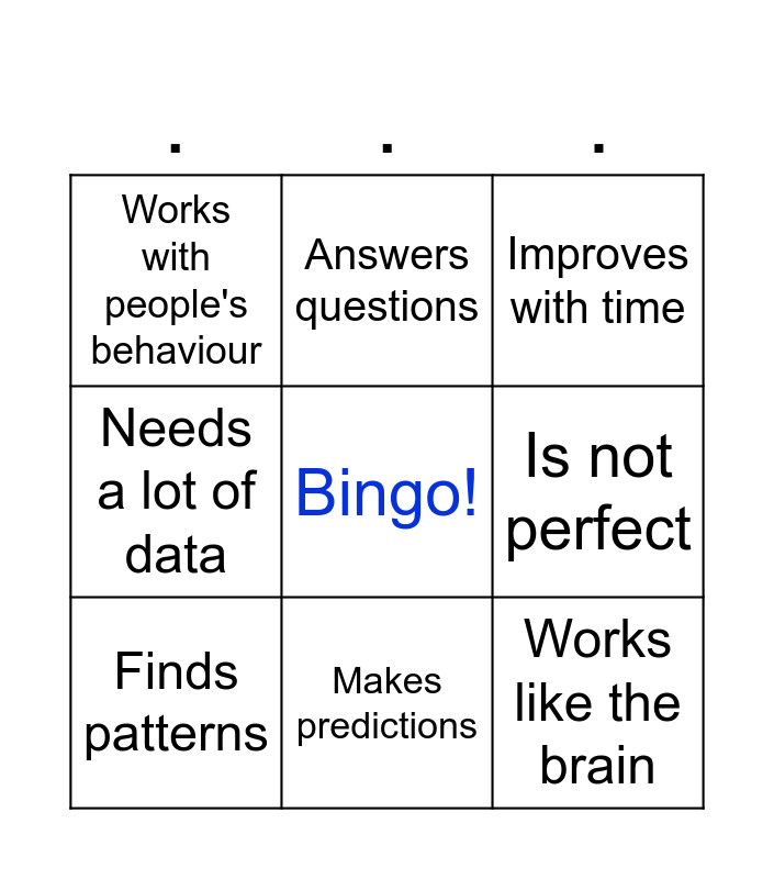 This bingo card has a free space and 11 words: Learns from data, Makes predictions, Works like the brain, Finds patterns, Answers questions, Improves with time, Is not perfect, Can recognize images, Needs a lot of data, Works with people's behaviour and Protects data against hackers.
