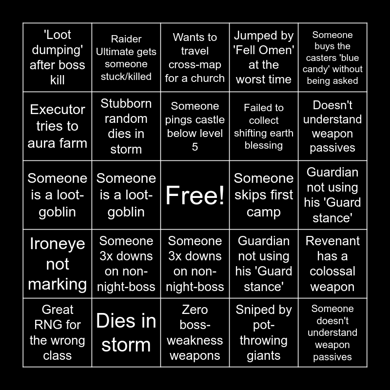 This bingo card has a free space and 48 words: Darth Vader, Someone doesn't understand weapon passives, Great RNG for the wrong class, Zero boss-weakness weapons, Someone 3x downs on non-night-boss, Ironeye not marking, Raider Ultimate gets someone stuck/killed, Someone spams pings, Executor tries to aura farm, Legendary from a silly place, Stubborn random dies in storm, Jumped by 'Fell Omen' at the worst time, Revenant has a colossal weapon, Guardian not using his 'Guard stance', Someone ignores your generosity, Someone dies mid-revive, Someone pings castle below level 5, Someone skips first camp, Someone wants to travel cross-map for a church, Someone buys the casters 'blue candy' without being asked, Someone is a loot-goblin, Sniped by pot-throwing giants, 'Loot dumping' after boss kill, Failed to collect shifting earth blessing, Darth Vader, Doesn't understand weapon passives, Great RNG for the wrong class, Zero boss-weakness weapons, Someone 3x downs on non-night-boss, Ironeye not marking, Raider Ultimate gets someone stuck/killed, Someone spams pings, Executor tries to aura farm, Legendary from a silly place, Dies in storm, Jumped by 'Fell Omen' at the worst time, Revenant has a colossal weapon, Guardian not using his 'Guard stance', Ignores your generosity, Dies mid-revive, Pings castle below level 5, Skips first camp, Wants to travel cross-map for a church, Buys the casters 'blue candy' without being asked, Someone is a loot-goblin, Sniped by pot-throwing giants, 'Loot dumping' after boss kill and Duchess full melee / Not using character skill.