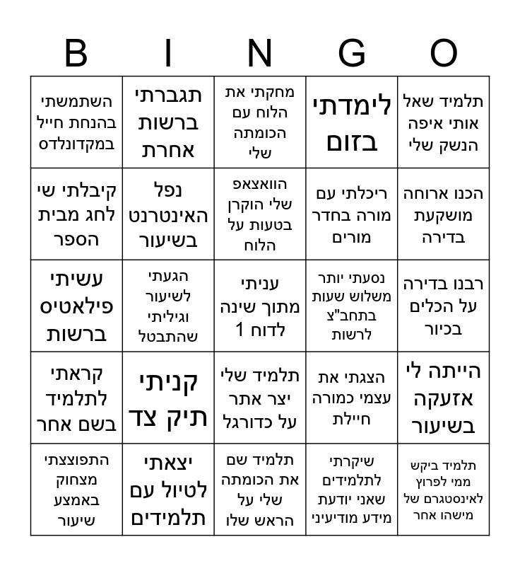 This bingo card has a free space and 24 words: קניתי תיק צד, יצאתי לטיול עם תלמידים, הוואצאפ שלי הוקרן בטעות על הלוח, התפוצצתי מצחוק באמצע שיעור, תלמיד שאל אותי איפה הנשק שלי, השתמשתי בהנחת חייל במקדונלדס, קיבלתי שי לחג מבית הספר, תגברתי ברשות אחרת, נסעתי יותר משלוש שעות בתחב"צ לרשות, תלמיד שלי יצר אתר על כדורגל, ריכלתי עם מורה בחדר מורים, עשיתי פילאטיס ברשות, הצגתי את עצמי כמורה חיילת, הייתה לי אזעקה בשיעור, נפל האינטרנט בשיעור, שיקרתי לתלמידים שאני יודעת מידע מודיעיני, רבנו בדירה על הכלים בכיור, מחקתי את הלוח עם הכומתה שלי, הכנו ארוחה מושקעת בדירה, הגעתי לשיעור וגיליתי שהתבטל, תלמיד ביקש ממי לפרוץ לאינסטגרם של מישהו אחר, קראתי לתלמיד בשם אחר, לימדתי בזום and תלמיד שם את הכומתה שלי על הראש שלו.