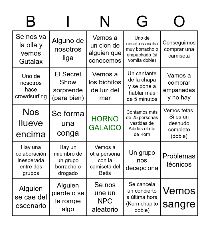 This bingo card has a free space and 24 words: Alguien se cae del escenario, Hay un miembro de un grupo borracho o drogado, Vemos a los bichitos de luz del mar, Se cancela un concierto a última hora (Korn chupito doble), Conseguimos comprar una camiseta, Se nos va la olla y vemos Gutalax, Alguno de nosotros liga, Vemos a un clon de alguien que conocemos, Contamos más de 25 personas vestidas de Adidas el día de Korn, Vemos tetas. Si es un desnudo completo (doble), Nos llueve encima, El Secret Show sorprende (para bien), Un grupo nos decepciona, Problemas técnicos, Uno de nosotros hace crowdsurfing, Alguien pierde o se le rompe algo, Se nos une un NPC aleatorio, Uno de nosotros acaba muy borracho o empachado (si vomita doble), Vamos a comprar empanadas y no hay, Hay una colaboración inesperada entre dos grupos, Se forma una conga, Vemos a otra persona con la camiseta del Betis, Un cantante de la chapa y se pone a hablar más de 5 minutos and Vemos sangre.