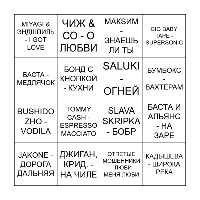This bingo card has 31 words: Free!, МАКС КОРЖ - ЖИТЬ В КАЙФ, БАСТА И АЛЬЯНС - НА ЗАРЕ, КОРОЛЬ И ШУТ - КУКЛА КОЛДУНА, MIYAGI & ЭНДШПИЛЬ - I GOT LOVE, МАКSИМ - ЗНАЕШЬ ЛИ ТЫ, SALUKI - ОГНЕЙ, Betsy, Мария Янковская - СИГМА БОЙ, ДЖИГАН, КРИД. - НА ЧИЛЕ, IOWA - УЛЫБАЙСЯ, ОТПЕТЫЕ МОШЕННИКИ - ЛЮБИ МЕНЯ ЛЮБИ, JAKONE - ДОРОГА ДАЛЬНЯЯ, КАСТА - ВОКРУГ ШУМ, BEARWOLF - ОДИН В ПОЛЕ ВОИН, TOMMY CASH - ESPRESSO MACCIATO, ALBLAK 52 - +7 (952) 812, ПОШЛАЯ МОЛЛИ - КОНТРАКТ, FEDUK / ЭЛДЖЕЙ - РОЗОВОЕ ВИНО, КАДЫШЕВА - ШИРОКА РЕКА, ЖУКИ - БАТАРЕЙКА, БАСТА - МЕДЛЯЧОК, ЗВЕРИ - РАЙОНЫ КВАРТАЛЫ, МАКС КОРЖ - МАЛЫЙ ПОВЗРОСЛЕЛ, ЧИЖ & СО - О ЛЮБВИ, BUSHIDO ZHO - VODILA, БОНД С КНОПКОЙ - КУХНИ, BIG BABY TAPE - SUPERSONIC, SLAVA SKRIPKA - БОБР, QUEST PISTOLS - ТЫ ТАК КРАСИВА, БУМБОКС - ВАХТЕРАМ and МАКАН A.V.G. - Я ПРИВЫКАЮ.