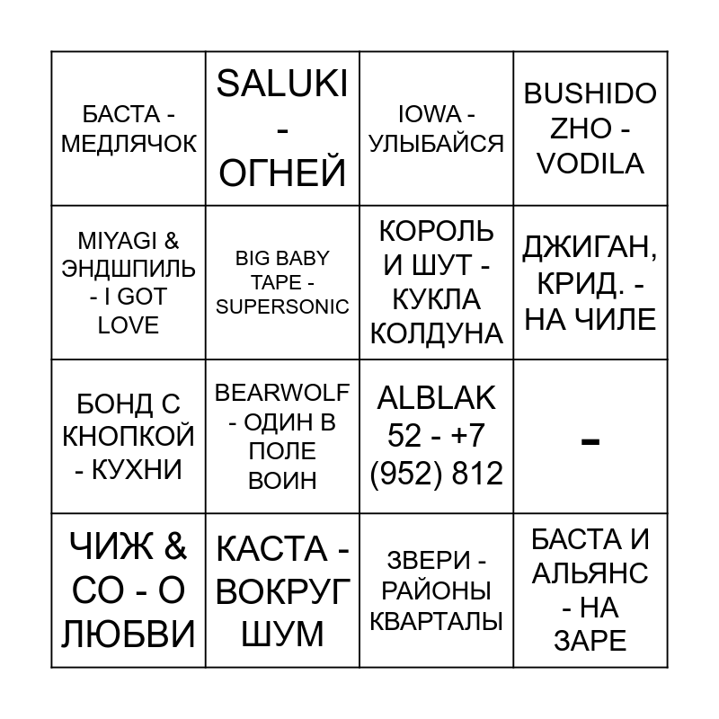 This bingo card has 33 words: Free!, МАКС КОРЖ, -, ЖИТЬ В КАЙФ, БАСТА И АЛЬЯНС - НА ЗАРЕ, КОРОЛЬ И ШУТ - КУКЛА КОЛДУНА, MIYAGI & ЭНДШПИЛЬ - I GOT LOVE, МАКSИМ - ЗНАЕШЬ ЛИ ТЫ, SALUKI - ОГНЕЙ, Betsy, Мария Янковская - СИГМА БОЙ, ДЖИГАН, КРИД. - НА ЧИЛЕ, IOWA - УЛЫБАЙСЯ, ОТПЕТЫЕ МОШЕННИКИ - ЛЮБИ МЕНЯ ЛЮБИ, JAKONE - ДОРОГА ДАЛЬНЯЯ, КАСТА - ВОКРУГ ШУМ, BEARWOLF - ОДИН В ПОЛЕ ВОИН, TOMMY CASH - ESPRESSO MACCIATO, ALBLAK 52 - +7 (952) 812, ПОШЛАЯ МОЛЛИ - КОНТРАКТ, FEDUK / ЭЛДЖЕЙ - РОЗОВОЕ ВИНО, КАДЫШЕВА - ШИРОКА РЕКА, ЖУКИ - БАТАРЕЙКА, БАСТА - МЕДЛЯЧОК, ЗВЕРИ - РАЙОНЫ КВАРТАЛЫ, МАКС КОРЖ - МАЛЫЙ ПОВЗРОСЛЕЛ, ЧИЖ & СО - О ЛЮБВИ, BUSHIDO ZHO - VODILA, БОНД С КНОПКОЙ - КУХНИ, BIG BABY TAPE - SUPERSONIC, SLAVA SKRIPKA - БОБР, QUEST PISTOLS - ТЫ ТАК КРАСИВА, БУМБОКС - ВАХТЕРАМ and МАКАН A.V.G. - Я ПРИВЫКАЮ.