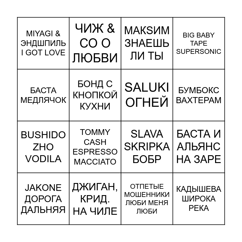This bingo card has 31 words: Free!, МАКС КОРЖ ЖИТЬ В КАЙФ, БАСТА И АЛЬЯНС НА ЗАРЕ, КОРОЛЬ И ШУТ КУКЛА КОЛДУНА, MIYAGI & ЭНДШПИЛЬ I GOT LOVE, МАКSИМ ЗНАЕШЬ ЛИ ТЫ, SALUKI ОГНЕЙ, Betsy, Мария Янковская СИГМА БОЙ, ДЖИГАН, КРИД. НА ЧИЛЕ, IOWA УЛЫБАЙСЯ, ОТПЕТЫЕ МОШЕННИКИ ЛЮБИ МЕНЯ ЛЮБИ, JAKONE ДОРОГА ДАЛЬНЯЯ, КАСТА ВОКРУГ ШУМ, BEARWOLF ОДИН В ПОЛЕ ВОИН, TOMMY CASH ESPRESSO MACCIATO, ALBLAK 52 +7 (952) 812, ПОШЛАЯ МОЛЛИ КОНТРАКТ, FEDUK / ЭЛДЖЕЙ РОЗОВОЕ ВИНО, КАДЫШЕВА ШИРОКА РЕКА, ЖУКИ БАТАРЕЙКА, БАСТА МЕДЛЯЧОК, ЗВЕРИ РАЙОНЫ КВАРТАЛЫ, МАКС КОРЖ МАЛЫЙ ПОВЗРОСЛЕЛ, ЧИЖ & СО О ЛЮБВИ, BUSHIDO ZHO VODILA, БОНД С КНОПКОЙ КУХНИ, BIG BABY TAPE SUPERSONIC, SLAVA SKRIPKA БОБР, QUEST PISTOLS ТЫ ТАК КРАСИВА, БУМБОКС ВАХТЕРАМ and МАКАН A.V.G. Я ПРИВЫКАЮ.