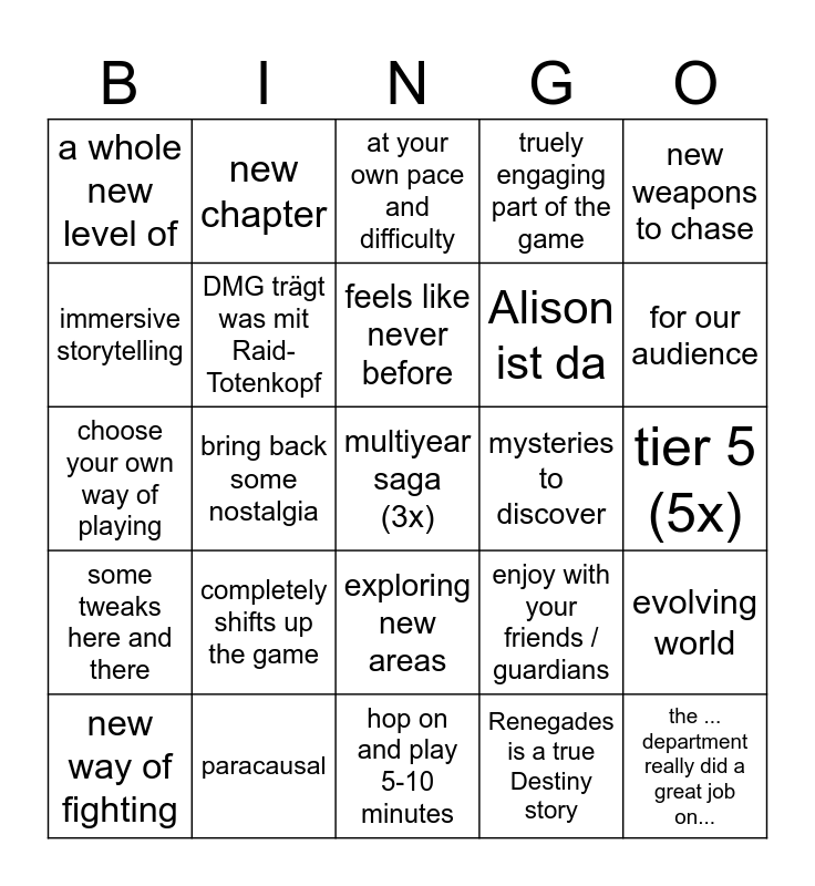 This bingo card has a free space and 24 words: completely shifts up the game, paracausal, feels like never before, new way of fighting, new weapons to chase, a whole new level of, immersive storytelling, new chapter, mysteries to discover, exploring new areas, Alison ist da, choose your own way of playing, enjoy with your friends / guardians, evolving world, DMG trägt was mit Raid-Totenkopf, Renegades is a true Destiny story, tier 5 (5x), at your own pace and difficulty, for our audience, bring back some nostalgia, the ... department really did a great job on..., some tweaks here and there, truely engaging part of the game and hop on and play 5-10 minutes.