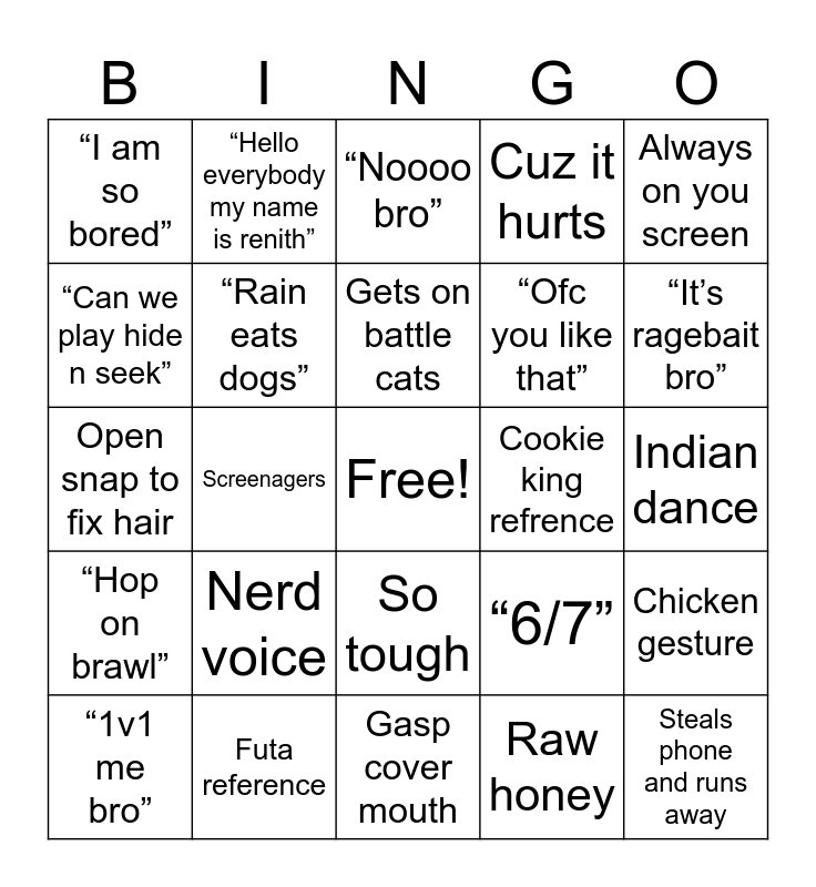 This bingo card has a free space and 24 words: Nerd voice, Futa reference, Gets on battle cats, “1v1 me bro”, Always on you screen, “I am so bored”, “Can we play hide n seek”, “Hello everybody my name is renith”, Cookie king refrence, So tough, “Ofc you like that”, Open snap to fix hair, “6/7”, Chicken gesture, “Rain eats dogs”, Raw honey, Indian dance, “Noooo bro”, “It’s ragebait bro”, Screenagers, Steals phone and runs away, “Hop on brawl”, Cuz it hurts and Gasp cover mouth.