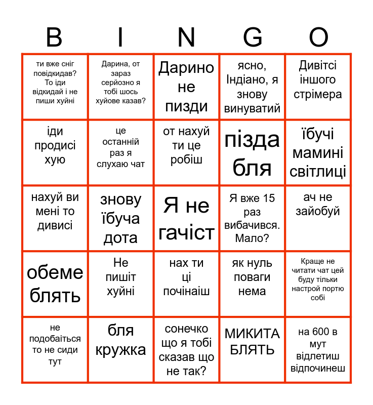This bingo card has a free space and 24 words: Не пишіт хуйні, бля кружка, от нахуй ти це робіш, не подобаіться то не сиди тут, Дивітсі іншого стрімера, ти вже сніг повідкидав? То іди відкидай і не пиши хуйні, іди продисі хую, Дарина, от зараз серйозно я тобі шось хуйове казав?, Я вже 15 раз вибачився. Мало?, нах ти ці почінаіш, пізда бля, нахуй ви мені то дивисі, як нуль поваги нема, Краще не читати чат цей буду тільки настрой портю собі, це останній раз я слухаю чат, МИКИТА БЛЯТЬ, ач не зайобуй, Дарино не пизди, їбучі мамині світлиці, знову їбуча дота, на 600 в мут відлетиш відпочинеш, обеме блять, ясно, Індіано, я знову винуватий and сонечко що я тобі сказав що не так?.