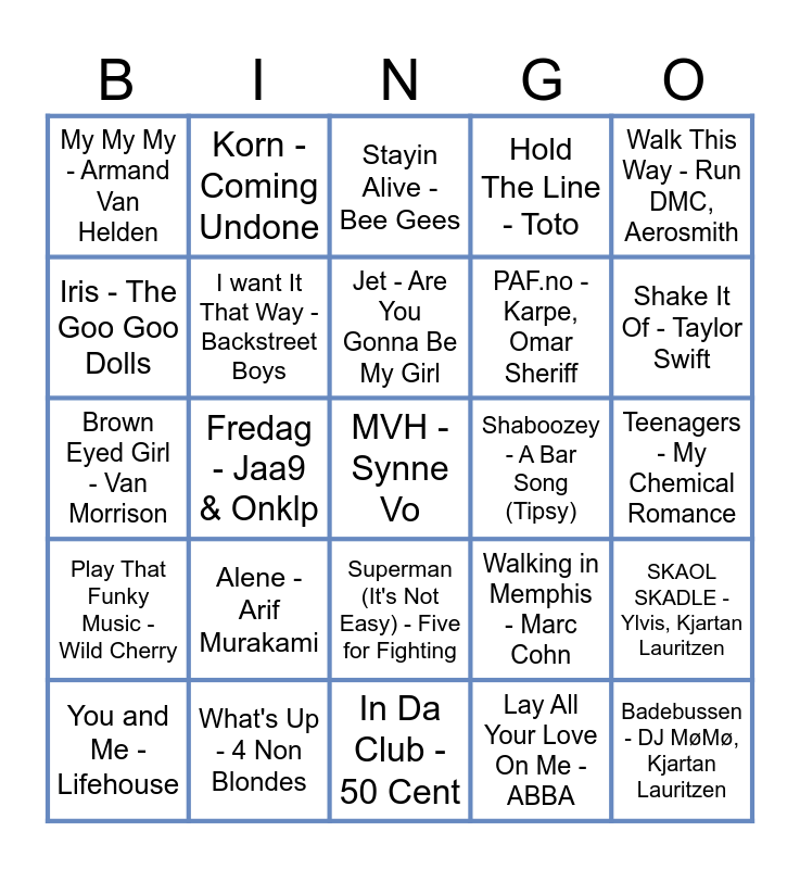 This bingo card has 35 words: Blur - Song 2, Uptown Funk - Mark Ronson, Bruno Mars, Gikk i bakken - Dårlig Vane, I want It That Way - Backstreet Boys, Superman (It's Not Easy) - Five for Fighting, Hold The Line - Toto, Iris - The Goo Goo Dolls, I Wanna Dance With Somebody - Whitney Houston, Jet - Are You Gonna Be My Girl, Total Eclipse of the Heart - Bonnie Tyler, Brown Eyed Girl - Van Morrison, Walk This Way - Run DMC, Aerosmith, Free!, Come Together - The Beatles, My My My - Armand Van Helden, Shaboozey - A Bar Song (Tipsy), Lay All Your Love On Me - ABBA, Fredag - Jaa9 & Onklp, Play That Funky Music - Wild Cherry, MVH - Synne Vo, Walking in Memphis - Marc Cohn, You and Me - Lifehouse, SKAOL SKADLE - Ylvis, Kjartan Lauritzen, What's Up - 4 Non Blondes, Stayin Alive - Bee Gees, Shake It Of - Taylor Swift, Badebussen - DJ MøMø, Kjartan Lauritzen, Situasjon - Ari Bajgora, PAF.no - Karpe, Omar Sheriff, Teenagers - My Chemical Romance, Svag - Victor Leksell, In Da Club - 50 Cent, Alene - Arif Murakami, Korn - Coming Undone and Balkong - Unge Ferrari / Stig Brenner.