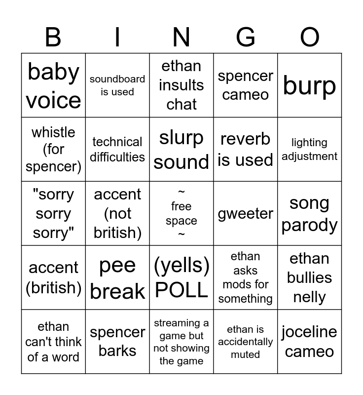 This bingo card has a free space and 41 words: "hold on", "sorry sorry sorry", ethan plays with his hair, technical difficulties, spencer barks, (yells) POLL, slurp sound, moan, burp, accent (british), accent (not british), spencer cameo, joceline cameo, song parody, gweeter, pee break, cute mug cameo, baby voice, chat's conversation is completely unrelated to stream, ethan insults chat, ethan bullies nelly, ethan bullies mods (not nelly), streaming a game but not showing the game, reverb is used, steam refund, chat is being gay, ethan is accidentally muted, asks chat a question and actually doesn't listen to the answer, lighting adjustment, ethan yells into the mic, "this is true", soundboard is used, ethan can't think of a word, ethan doesn't finish a sentence / question, ethan asks mods for something, whistle (for spencer), whistle (general), ethan asks chat if volume is good, unus annus reference / mention, chat tries to summon rich gays and two separate audios at once.