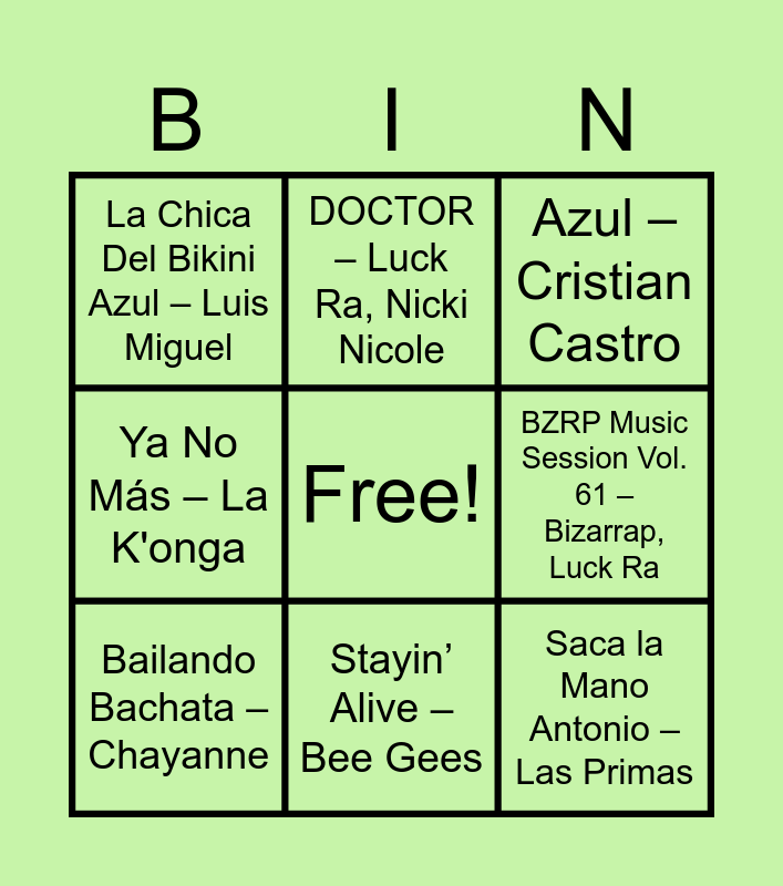 This bingo card has a free space and 31 words: TEXAS HOLD 'EM – Beyoncé, FUE CULPA TUYA – Luck Ra, Tiago PZK, QUE SED – Luck Ra, Ulises Bueno, Con Otra – Cazzu, La Chica Del Bikini Azul – Luis Miguel, Azul – Cristian Castro, Bailando Bachata – Chayanne, La Bilirrubina – Juan Luis Guerra, Rosa… Rosa – Sandro, Despeinada – Palito Ortega, Te Quiero Tanto, No Me Preguntes Más – Sergio Denis, Tren del Cielo – Soledad, Natalia Pastorutti, Y Qué? – Paz Martínez, Una Mujer Como Tú – Luciano Pereyra, Los Ángeles Azules, La Guitarra – Los Auténticos Decadentes, SINVERGÜENZA – Emanero, Karina, J Mena, Ángela Torres, Universo Paralelo – La K'onga, Nahuel Pennisi, Ocho Cuarenta – Rodrigo, Fama de Diabla – La K'onga, David Bisbal, Emanero, SUAVEMENTE – Luck Ra, Elvis Crespo, Saca la Mano Antonio – Las Primas, La Reina de la Bailanta – Cacho Castaña, Estrellita de Madrugada – Omega, Daddy Yankee, DOCTOR – Luck Ra, Nicki Nicole, Ya Me Cansé – Valentino Merlo, Eugenia Quevedo, Emanero, BZRP Music Session Vol. 61 – Bizarrap, Luck Ra, Ya No Más – La K'onga, Piel – Tiago PZK, Ke Personajes, NUEVAYoL – Bad Bunny, Stayin’ Alive – Bee Gees and Swing – Danny Ocean.