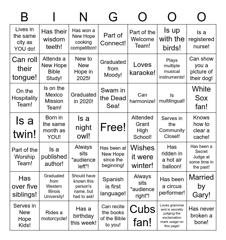 This bingo card has a free space and 55 words: Cubs fan!, White Sox fan!, Has read through the whole Bible!, Lives in the same city as YOU do!, Born in the same month as YOU!, Graduated from Western Illinois University!, Is a registered nurse!, Loves the NY Knicks!, Attends a New Hope Bible Study!, Should have known this person's name, but had to ask!, Part of Connect!, Has been a Secret Judge at some time in the past!, Knows how to clear a cache!, Serves in the Community Closet!, Serves in New Hope Kids!, Part of the Worship Team!, Part of the Welcome Team!, Loves karaoke!, Loves grammar and is secretly judging the exclamation mark usage on this page!, Plays multiple musical instruments!, Can show you a picture of their dog!, Is a published author!, Can harmonize!, Has won a New Hope cooking competition!, Is an elder!, Can roll their tongue!, Is a night owl!, Is going boating this week—maybe today!, On the Hospitality Team!, Is multilingual!, Can recite a Bible verse from Hebrews 11!, Has ridden in a hot air balloon!, Married by Gary!, Rides a motorcycle!, Is up with the birds!, Graduated from Moody!, Has over five siblings!, Is on the Mexico Mission Team!, Has never broken a bone!, Always sits "audience left"!, Has their wisdom teeth!, Spanish is first language!, Always sits "audience right"!, Has a non-dog pet!, Graduated in 2020!, Is a twin!, Has a birthday this week!, Wishes it were winter!, Attended Grant High School!, New to New Hope in 2025!, Has been at New Hope since the beginning!, Has been a circus performer!, Can recite the books of the Bible to you!, Swam in the Dead Sea! and Has a collection! (p.s. Ask what it is!).