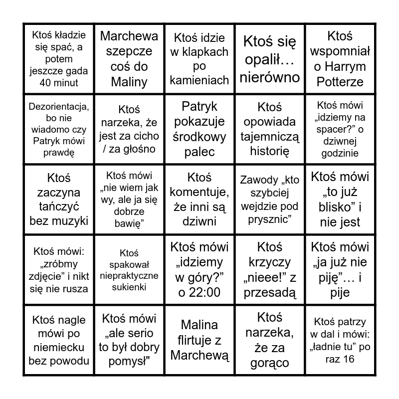 This bingo card has 25 words: Ktoś spakował niepraktyczne sukienki, Malina flirtuje z Marchewą, Patryk pokazuje środkowy palec, Ktoś nagle mówi po niemiecku bez powodu, Ktoś wspomniał o Harrym Potterze, Ktoś kładzie się spać, a potem jeszcze gada 40 minut, Dezorientacja, bo nie wiadomo czy Patryk mówi prawdę, Marchewa szepcze coś do Maliny, Zawody „kto szybciej wejdzie pod prysznic”, Ktoś mówi „idziemy w góry?” o 22:00, Ktoś opowiada tajemniczą historię, Ktoś zaczyna tańczyć bez muzyki, Ktoś krzyczy „nieee!” z przesadą, Ktoś mówi „ja już nie piję”… i pije, Ktoś narzeka, że jest za cicho / za głośno, Ktoś patrzy w dal i mówi: „ładnie tu” po raz 16, Ktoś mówi „to już blisko” i nie jest, Ktoś idzie w klapkach po kamieniach, Ktoś mówi „idziemy na spacer?” o dziwnej godzinie, Ktoś mówi „nie wiem jak wy, ale ja się dobrze bawię”, Ktoś komentuje, że inni są dziwni, Ktoś mówi „ale serio to był dobry pomysł", Ktoś mówi: „zróbmy zdjęcie” i nikt się nie rusza, Ktoś się opalił… nierówno and Ktoś narzeka, że za gorąco.