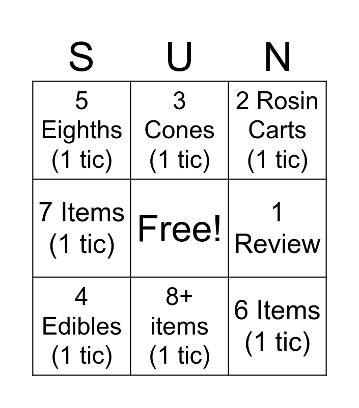 This bingo card has a free space and 8 words: 1 Review, 2 Rosin Carts (1 tic), 3 Cones (1 tic), 4 Edibles (1 tic), 5 Eighths (1 tic), 6 Items (1 tic), 7 Items (1 tic) and 8+ items (1 tic).