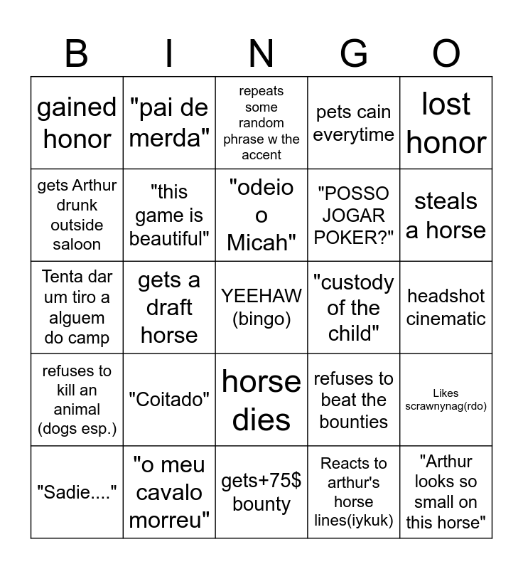 This bingo card has a free space and 24 words: "Coitado", "o meu cavalo morreu", "odeio o Micah", "Sadie....", lost honor, gained honor, gets Arthur drunk outside saloon, "pai de merda", "custody of the child", horse dies, "POSSO JOGAR POKER?", Tenta dar um tiro a alguem do camp, refuses to beat the bounties, Likes scrawnynag(rdo), "this game is beautiful", Reacts to arthur's horse lines(iykuk), headshot cinematic, repeats some random phrase w the accent, steals a horse, gets a draft horse, "Arthur looks so small on this horse", refuses to kill an animal (dogs esp.), pets cain everytime and gets+75$ bounty.