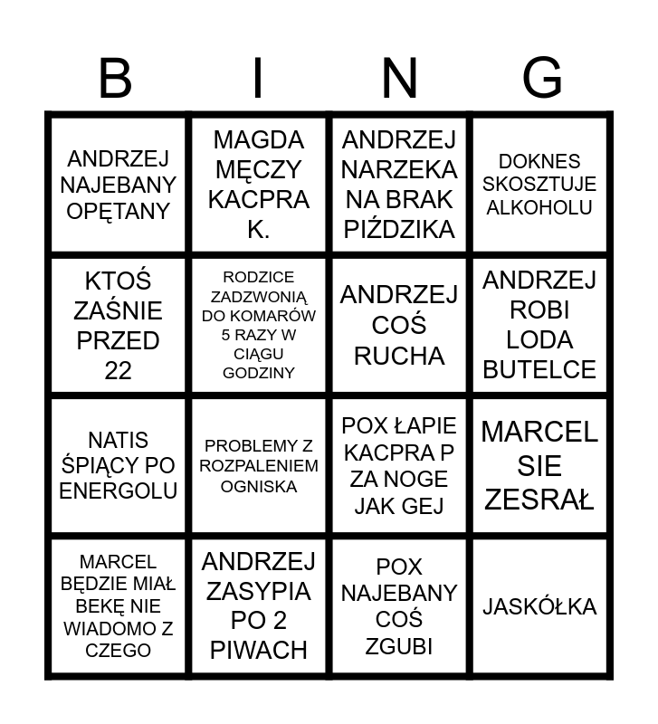 This bingo card has 16 words: ANDRZEJ ZASYPIA PO 2 PIWACH, MARCEL SIE ZESRAŁ, ANDRZEJ NARZEKA NA BRAK PIŹDZIKA, ANDRZEJ NAJEBANY OPĘTANY, NATIS ŚPIĄCY PO ENERGOLU, MAGDA MĘCZY KACPRA K., POX ŁAPIE KACPRA P ZA NOGE JAK GEJ, POX NAJEBANY COŚ ZGUBI, KTOŚ ZAŚNIE PRZED 22, RODZICE ZADZWONIĄ DO KOMARÓW 5 RAZY W CIĄGU GODZINY, MARCEL BĘDZIE MIAŁ BEKĘ NIE WIADOMO Z CZEGO, DOKNES SKOSZTUJE ALKOHOLU, PROBLEMY Z ROZPALENIEM OGNISKA, ANDRZEJ ROBI LODA BUTELCE, ANDRZEJ COŚ RUCHA and JASKÓŁKA.