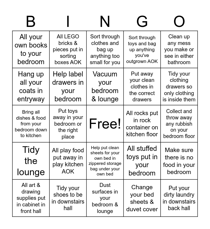 This bingo card has a free space and 24 words: All play food put away in play kitchen AOK, Tidy your shoes to be in downstairs hall, Vacuum your bedroom & lounge, All art & drawing supplies put in cabinet in front hall, Clean up any mess you make or see in either bathroom, All your own books to your bedroom, Hang up all your coats in entryway, All LEGO bricks & pieces put in sorting boxes AOK, All rocks put in rock container on kitchen floor, Help put clean sheets for your own bed in zippered storage bag under your own bed, Put away your clean clothes in the correct drawers, Bring all dishes & food from your bedroom down to kitchen, All stuffed toys put in your bedroom, Make sure there is no food in your bedroom, Help label drawers in your bedroom, Change your bed sheets & duvet cover, Collect and throw away any rubbish on your bedroom floor, Sort through clothes and bag up anything too small for you, Tidy your clothing drawers so only clothing is inside them, Put toys away in your bedroom or the right place, Put your dirty laundry in downstairs back hall, Tidy the lounge, Sort through toys and bag up anything you've outgrown AOK and Dust surfaces in your bedroom & lounge.