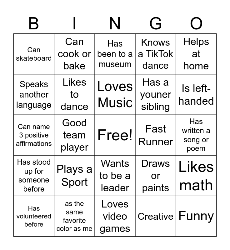 This bingo card has a free space and 53 words: Good Listener, Funny, Kind to Others, Creative, Plays a Sport, Loves to Read, Can cook or bake, Has a pet, Speaks another language, Writes poems, Likes to dance, Has been on a trip, Likes math, Draws or paints, Can sing, Has volunteered before, Loves Music, Fast Runner, Has a unique hobby, Helps at home, Good team player, Enjoys school, Has a youner sibling, Can skateboard, Loves animals, as the same favorite color as me, Can whistle, Knows how to braid hair, Has traveled out of state, Is left-handed, Can do a cartwheel, Loves to sing in the shower, Has met someone famous, Loves spicy food, Can count to 10 in another language, Has a birthday in the summer, Knows a TikTok dance, Loves video games, Has been to a museum, Loves to draw anime or cartoons, Has a unique nickname, Is the oldest child in their family, Has written a song or poem, Loves science, Is good at math, Wants to be a leader, Has made their own money (chores, job, etc.), Likes helping others solve problems, Can name 3 positive affirmations, Has stood up for someone before, Knows how to garden or plant something, Has led a group or team before and Brings positive energy to a group.