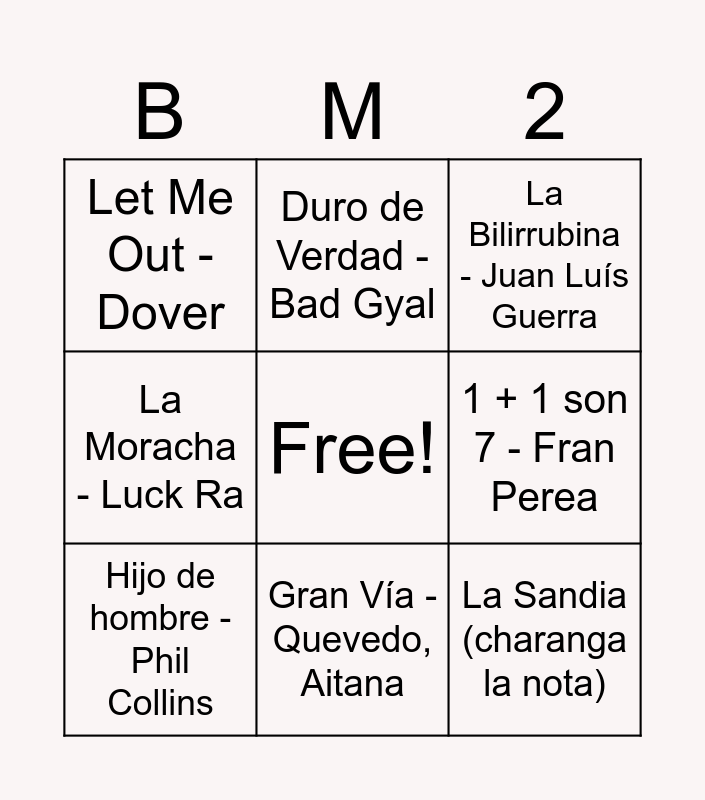This bingo card has a free space and 67 words: Debí tirar más fotos (DtMF) - Bad Bunny, A la sombra de la sierra - La Raíz, El Fin del Mundo - LaLa Love You, La Playa - La Oreja de Vangogh, Me voy - Julieta Venegas, Esa Diva - Melody, Let Me Out - Dover, Días de Verano - Amaral, Virtual Diva - Don Omar, This is me - Camp Rock, Noche de sexo - Wishing Yandel, Romeo Santos, Un beso y una flor - Nino Bravo, Tacones Rojos - Sebastian Yatra, Gran Vía - Quevedo, Aitana, Corazón de Tango - Doctor Deseo, La Moracha - Luck Ra, Paseo - Estopa, La Bilirrubina - Juan Luís Guerra, La Revolución sexual - La casa azul, Señoras Bien - Las Bistec, Vivir es morir de amor - Camilo Sesto, Wishky barato - Fito y Fitipaldis, Duro de Verdad - Bad Gyal, Toda la noche en la calle - Amaral, ¡Ay Paquita! - ROSALIA, Amores de barra - Ella baila sola, La vereda de la puerta de atras - Extremoduro, En que estrella estarás - Nena Daconte, Jardín de rosas - Duncan Dhu, Unwritten - Natasha Bedingfield, Hijo de hombre - Phil Collins, The best of both words - Hannah Montana, Clavado en un bar - Maná, Voy a pasarmelo bien - Hombres G, La primavera trompetera - Los delinquentes, Tusa - Karol G, Son de amores - Andy&Lucas, Partiendo la pana - Estopa, Ay Mama - Rigoberta Bandini, Taki Taki - DJ Snake, Ozuna, Selena Gomez, Espresso Macciato - Tommy Cash, La Sandia (charanga la nota), Barbie de extrarradio - Melendi, You´re the one that i want - Grease, Bailare sobre tu tumba - siniestro total, Feo, fuerte y formal - Loquillo, Potra salvaje - Isabel Aiun, Hakuna Matata - El rey león, 6 de febrero - Aitana, Los perros - Arde Bogota, 1 + 1 son 7 - Fran Perea, Toxic - Britney Spears, Pa aqui pa alla - La Fuga, Hay un amigo en mi - Toy Story, The nights - Avicci, Maquillaje - Mecano, Mediterraneo - Serrat, El secreto de las tortugas - Maldita Nerea, El rompeolas - Loquillo, Soy un Truhán, soy un señor - Julio Iglesias, Baila Morena - Zucchero, En blanco y negro - Barricada, Manu Chao - Me llaman calle, Ella - Bebe, Aquí no hay playa - The refrescos, Te estoy amando locamente - Las Grecas and Feeling Good - Nina Simone.