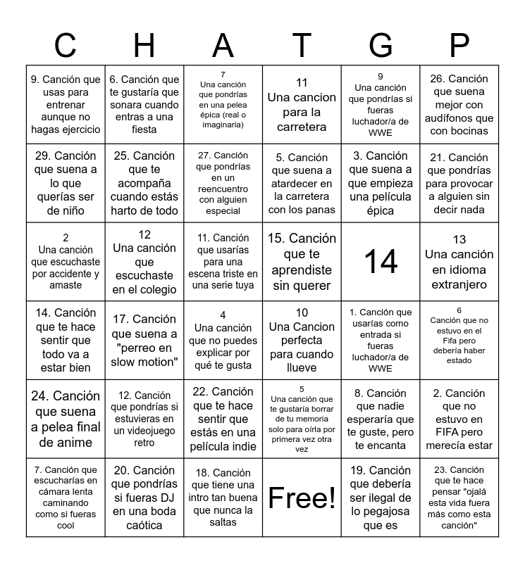 This bingo card has 45 words: 1 Una Canción que te sabes y detestas, 2 Una canción que escuchaste por accidente y amaste, 3 Una canción que odiaste la primera vez y ahora te encanta, 4 Una canción que no puedes explicar por qué te gusta, 5 Una canción que te gustaría borrar de tu memoria solo para oírla por primera vez otra vez, 6 Canción que no estuvo en el Fifa pero debería haber estado, 7 Una canción que pondrías en una pelea épica (real o imaginaria), 8 Una canción que te transporta a un lugar específico, 9 Una canción que pondrías si fueras luchador/a de WWE, 10 Una Cancion perfecta para cuando llueve, 11 Una cancion para la carretera, 12 Una canción que escuchaste en el colegio, 13 Una canción en idioma extranjero, 14, Free!, 1. Canción que usarías como entrada si fueras luchador/a de WWE, 2. Canción que no estuvo en FIFA pero merecía estar, 3. Canción que suena a que empieza una película épica, 4. Canción que te pone en "modo villano" automáticamente, 5. Canción que suena a atardecer en la carretera con los panas, 6. Canción que te gustaría que sonara cuando entras a una fiesta, 7. Canción que escucharías en cámara lenta caminando como si fueras cool, 8. Canción que nadie esperaría que te guste, pero te encanta, 9. Canción que usas para entrenar aunque no hagas ejercicio, 10. Canción que suena a que va a estallar el mundo y tú eres el héroe, 11. Canción que usarías para una escena triste en una serie tuya, 12. Canción que pondrías si estuvieras en un videojuego retro, 13. Canción que suena a despedida épica, 14. Canción que te hace sentir que todo va a estar bien, 15. Canción que te aprendiste sin querer, 16. Canción que debería cerrar todos los conciertos del mundo, 17. Canción que suena a "perreo en slow motion", 18. Canción que tiene una intro tan buena que nunca la saltas, 19. Canción que debería ser ilegal de lo pegajosa que es, 20. Canción que pondrías si fueras DJ en una boda caótica, 21. Canción que pondrías para provocar a alguien sin decir nada, 22. Canción que te hace sentir que estás en una película indie, 23. Canción que te hace pensar "ojalá esta vida fuera más como esta canción", 24. Canción que suena a pelea final de anime, 25. Canción que te acompaña cuando estás harto de todo, 26. Canción que suena mejor con audífonos que con bocinas, 27. Canción que pondrías en un reencuentro con alguien especial, 28. Canción que te dan ganas de poner en bucle sin razón, 29. Canción que suena a lo que querías ser de niño and 30. Canción que resume tu personalidad sin tener que decir nada.