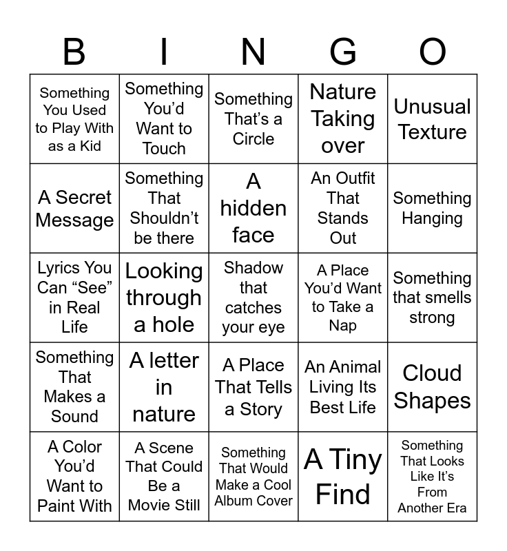 This bingo card has 37 words: Free!, A Reflection of Yourself, Something to Eat, Something That Shouldn’t be there, Cloud Shapes, A letter in nature, A hidden face, A spot that looks comfortable to sit, Unusual Texture, Something in Motion, Looking through a hole, Nature Taking over, Shadow that catches your eye, Something that smells strong, A Secret Message, Something That Makes a Sound, A Tree That Stands Out, Something That’s a Circle, A Place That Tells a Story, A Place You’d Want to Take a Nap, Something You Used to Play With as a Kid, Something Hanging, A Color You’d Want to Paint With, Something That Would Make a Cool Album Cover, A Natural Pattern Made, A Tiny Find, Something You’d Want to Touch, A Place That Feels Forgotten, A Color Clash, Animal Evidence, Unexpected Symmetry, A Scene That Could Be a Movie Still, Lyrics You Can “See” in Real Life, Something That Looks Like It’s From Another Era, An Animal Living Its Best Life, An Outfit That Stands Out and A Collection of the Same Thing.