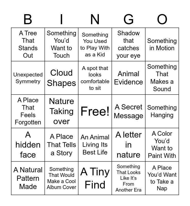 This bingo card has a free space and 36 words: A Reflection of Yourself, Something to Eat, Something That Shouldn’t be there, Cloud Shapes, A letter in nature, A hidden face, A spot that looks comfortable to sit, Unusual Texture, Something in Motion, Looking through a hole, Nature Taking over, Shadow that catches your eye, Something that smells strong, A Secret Message, Something That Makes a Sound, A Tree That Stands Out, Something That’s a Circle, A Place That Tells a Story, A Place You’d Want to Take a Nap, Something You Used to Play With as a Kid, Something Hanging, A Color You’d Want to Paint With, Something That Would Make a Cool Album Cover, A Natural Pattern Made, A Tiny Find, Something You’d Want to Touch, A Place That Feels Forgotten, A Color Clash, Animal Evidence, Unexpected Symmetry, A Scene That Could Be a Movie Still, Lyrics You Can “See” in Real Life, Something That Looks Like It’s From Another Era, An Animal Living Its Best Life, An Outfit That Stands Out and A Collection of the Same Thing.