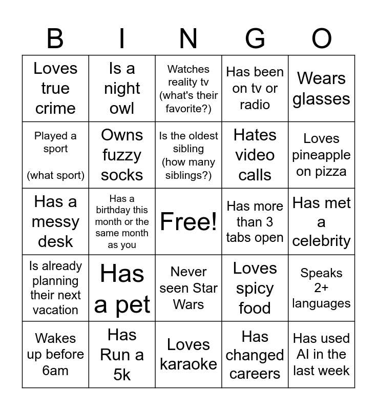 This bingo card has a free space and 24 words: Has a pet, Has Run a 5k, Is the oldest sibling (how many siblings?), Wakes up before 6am, Wears glasses, Loves true crime, Played a sport (what sport), Is a night owl, Has more than 3 tabs open, Never seen Star Wars, Hates video calls, Has a messy desk, Loves spicy food, Speaks 2+ languages, Owns fuzzy socks, Has changed careers, Has met a celebrity, Watches reality tv (what's their favorite?), Loves pineapple on pizza, Has a birthday this month or the same month as you, Has used AI in the last week, Is already planning their next vacation, Has been on tv or radio and Loves karaoke.